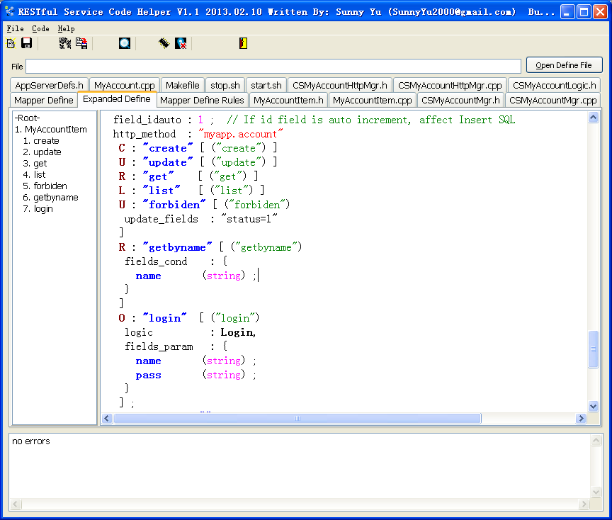 With this simple IDE, can easy check the define errors and preview the generated server side source code. Here is a REST Service Define.